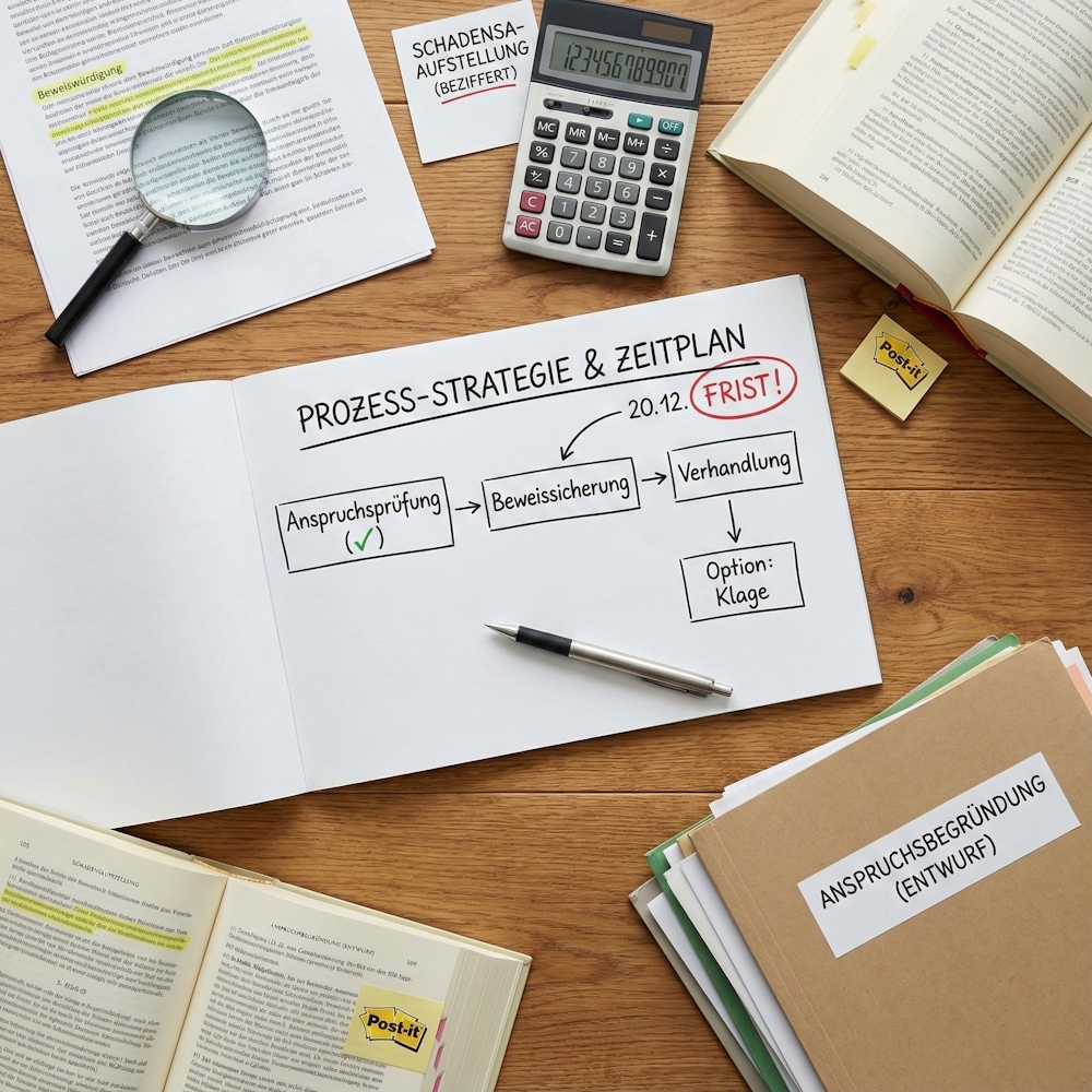 Als nächster Schritt empfiehlt sich: Schadenpositionen tabellarisch sammeln, Beweise zuordnen, Fristen notieren und eine erste Anspruchsstrategie festlegen – außergerichtlich mit Fristsetzung oder, wenn nötig, durch gerichtliche Schritte. So vermeiden Sie, dass Zeit verloren geht oder die Gegenseite den Takt vorgibt.